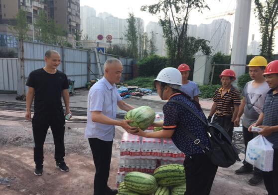 興瀘居泰公司為工友們準(zhǔn)備了解暑的西瓜,清涼的礦泉水,以及夏日解暑藥品。楊旭東副總一邊分發(fā)物資,一邊強(qiáng)調(diào):夏日施工,安全第一,要注意防暑降溫,合理安排作息時(shí)間,確保平平安安上班。實(shí)實(shí)在在的讓工友們感受到了“清涼“關(guān)懷。