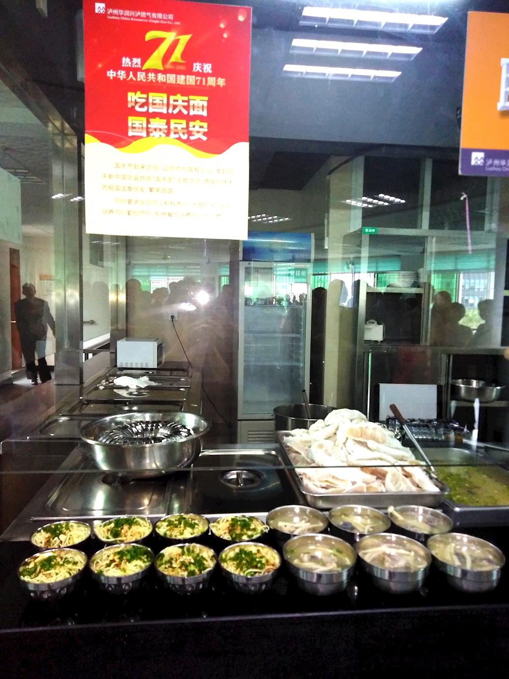 為慶祝中華人民共和國成立71周年,傳遞新時代愛國主義教育精神,9月28日中午,瀘州華潤興瀘燃氣有限公司在員工食堂開展了別開生面的共吃“國慶面”主題活動。